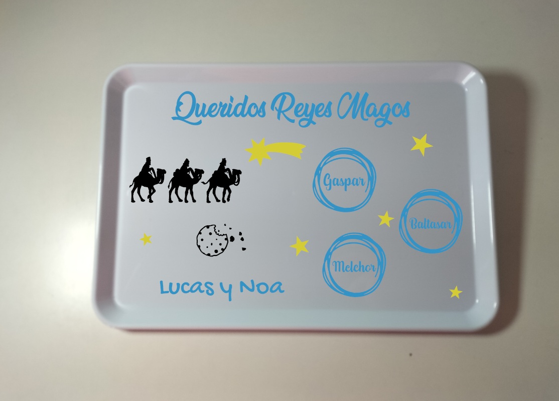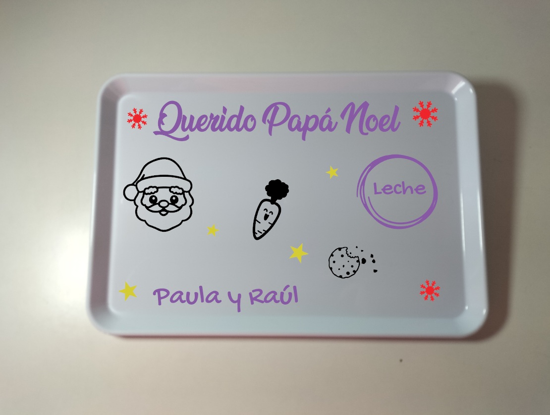 Bandeja de plástico personalizada con vinilo adhesivo, para dejar un picoteo a los reyes magos o papá noel