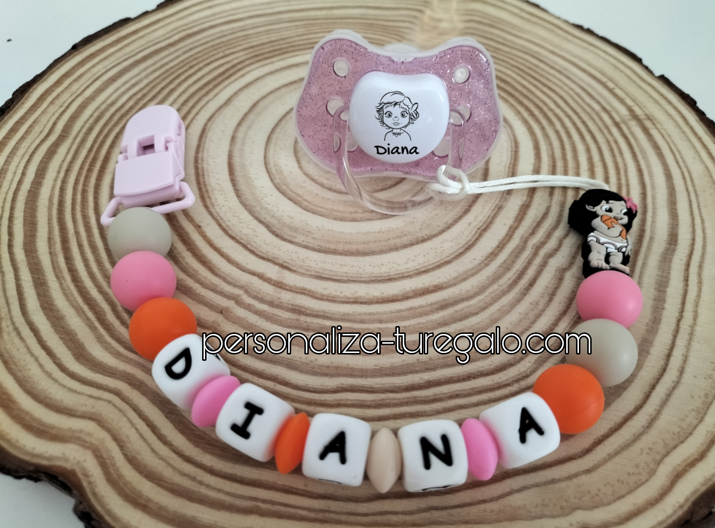 -Personalizado con el nombre de tu bebé. Es ideal para aliviar los dolores de la dentición, para no perder su chupete o su mordedor, incluso para ser diferenciados en la guarde.