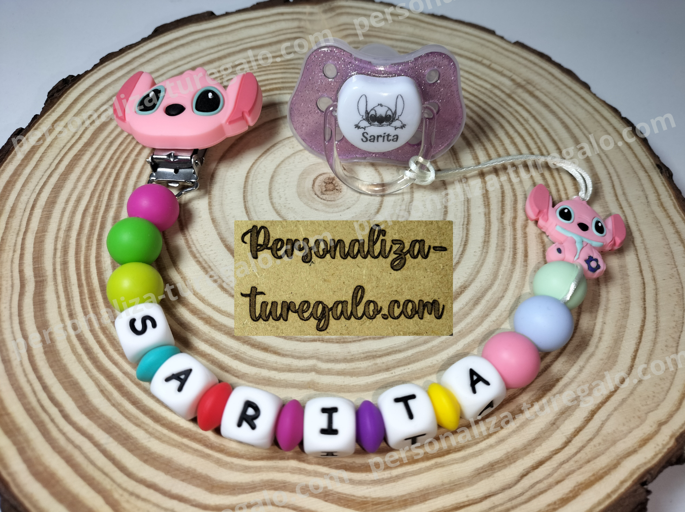 -Personalizado con el nombre de tu bebé. Es ideal para aliviar los dolores de la dentición, para no perder su chupete o su mordedor, incluso para ser diferenciados en la guarde.