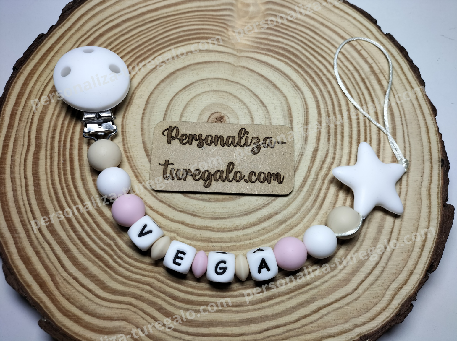 -Personalizado con el nombre de tu bebé. Es ideal para aliviar los dolores de la dentición, para no perder su chupete o su mordedor, incluso para ser diferenciados en la guarde.