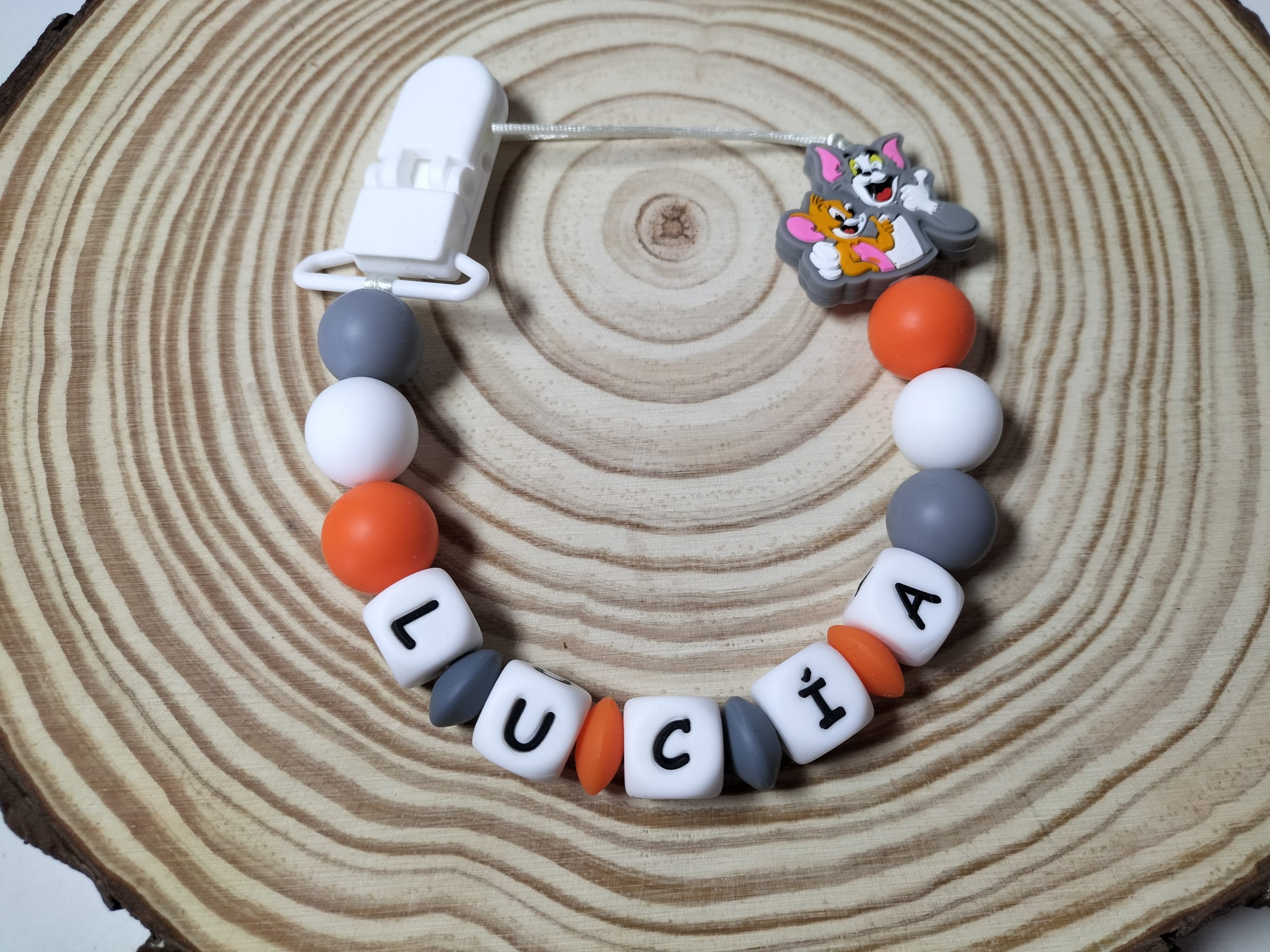 -Personalizado con el nombre de tu bebé. Es ideal para aliviar los dolores de la dentición, para no perder su chupete o su mordedor, incluso para ser diferenciados en la guarde.