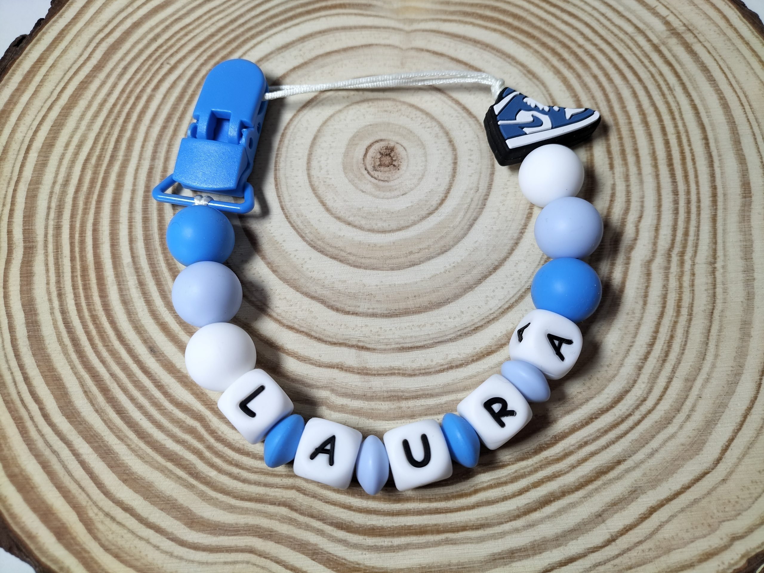 -Personalizado con el nombre de tu bebé. Es ideal para aliviar los dolores de la dentición, para no perder su chupete o su mordedor, incluso para ser diferenciados en la guarde.