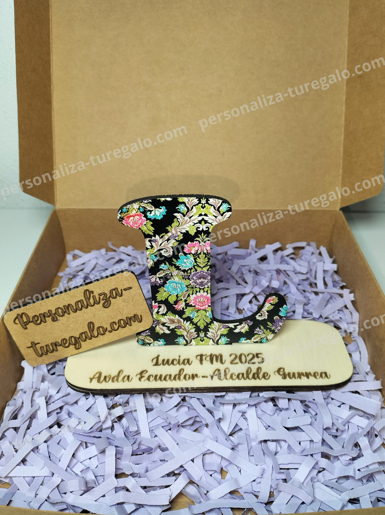 Letra de madera personalizada con impresión de tela fallara y peana grabada